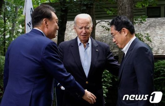 윤석열 대통령과 조 바이든 미국 대통령, 기시다 후미오 일본 총리가 18일(현지시간) 미국 워싱턴DC 인근 대통령 별장인 캠프 데이비드에서 열린 한미일 정상회의에 앞서 인사를 나누고 있다. 캠프데이비드 로이터 뉴스1 |