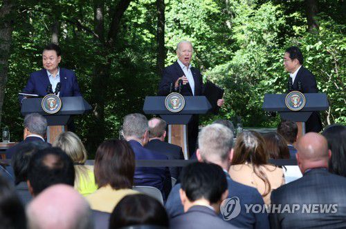(캠프 데이비드=연합뉴스) 안용수 이동환 기자 = 윤석열 대통령과 조 바이든 미국 대통령, 기시다 후미오 일본 총리는 18일(현지시간) 한미일 협력 강화가 3국에 공동 이익을 가져다줄 수 있다고 강조했다.