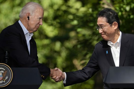 18일(현지시간) 메릴랜드주 서몬트 인근 대통령 별장인 캠프 데이비드에서 조 바이든(왼쪽) 대통령이 기시다 후미오 일본 총리와 악수하고 있다.[AP] |