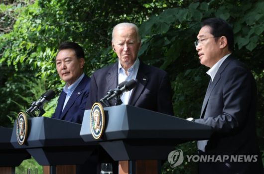기시다 후미오 일본 총리가 18일(현지시간) 워싱턴DC 인근 미국 대통령 별장인 캠프 데이비드에서 열린 한미일 정상 공동기자회견에서 발언하고 있다. 왼쪽부터 윤석열 대통령, 바이든 미 대통령, 기시다 일본 총리. 공동취재 |