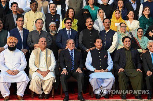 9일 의회 해산 직전 의원들과 셰바즈 샤리프 당시 총리(앞줄 왼쪽에서 세번째)가 찍은 단체 사진 |