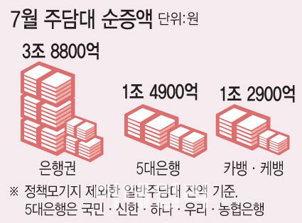 5대 은행(KB국민·신한·하나·우리·NH농협)과 비교해도 두 인터넷은행은 주담대를 공격적으로 취급했다. 5대 은행의 전체 주담대는 지난달 3조3900억원 늘었지만, 정책모기지를 제외한 일반 주담대 순증액은 1조4900억원이었다. 카카오뱅크와 케이뱅크가 5대 은행을 합한 만큼 주담대를 취급한 것이다.