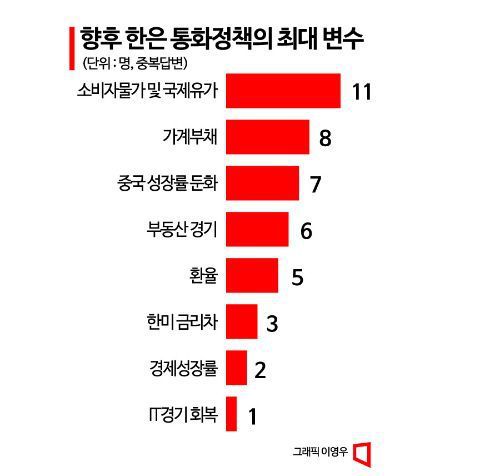 아시아경제가 21일 국내외 증권사 애널리스트, 경제연구소 연구원 등 21명을 대상으로 설문조사를 실시한 결과, 상당수 전문가는 앞으로 한은 통화정책의 핵심 변수(중복답변)로 국제유가를 비롯한 물가 상승과 중국 경기 둔화, 가계부채 증가를 꼽았다. 한은의 최우선 관심사인 물가가 11명으로 가장 많았고, 가계부채(8명)와 중국 성장률 둔화(7명)가 팽팽하게 뒤를 이었다.