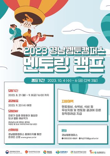 멘토링 캠프는 오는 10월 4일부터 6일까지 문화체육관광부, 한국만화영상진흥원의 지원을 받아 사업 수탁기관인 경남문화예술진흥원 경남웹툰캠퍼스에서 진행된다.