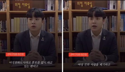 최인호 서울 관악구의원은 지난해 12월 자신의 유튜브에서 관악구는 여성친화도시라고 홍보를 많이 하는 편이라며 여성친화사업을 폐기할 것이라고 밝혔다. 유튜브 '성평화 최인호' 캡처 |