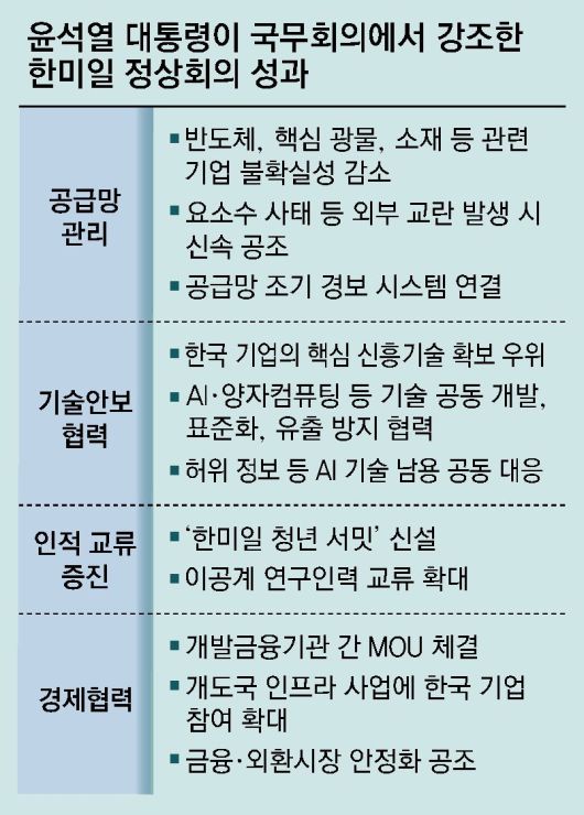 윤 대통령은 “이번 한미일 정상회의 계기에 3국 개발금융기관 간 업무협약(MOU)도 체결됐다”며 “개발도상국의 정보통신기술(ICT), 에너지, 항만 등 인프라 개발 사업에 역량 있는 우리 기업들의 참여 기회가 더욱 확대될 것”이라고 말했다. 또 국무회의 마무리 발언에서는 “한미일 3국이 협력함으로써 안보 위험이 줄어들 뿐만 아니라 경제는 우리 기업과 국민이 진출할 수 있는 더 큰 시장을 갖게 될 것”이라고 강조했다.