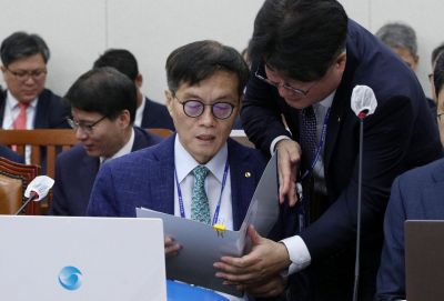 이창용 한국은행 총재가 5일 국회에서 열린 기획재정위원회 전체회의에서 관계자와 대화하고 있다. 사진=김현민 기자 kimhyun81@ |