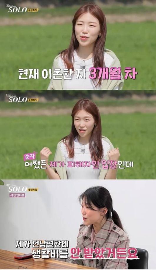 한편 '나는 솔로'에 출연 중인 16기 순자는 27살에 딸을 출산하고 28살에 사실혼 관계로 결혼생활을 시작했지만 현재 이혼 3개월 차라고 밝혔다. 순자는 방송에서 "어쨌든 제가 피해자인데 내가 피해자라고 슬퍼하고 있을 수 없었다"며 "나도 빨리 행복해져야지. 그래서 여기 나와야겠다고 생각하고 왔다"고 고백했다. 그러면서 "잘 온 것 같다. 보란듯이 잘 살 거라고 나의 존엄을 챙겨줄 것"이라고 말했다.