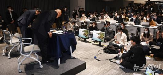 남궁훈(오른쪽)·홍은택 카카오 당시 각자대표가 카카오판교아지트에서 데이터 센터 화재로 인한 대규모 먹통 사태와 관련해 대국민 사과를 하고 있다. 사진=이수길 기자 leo2004@newsway.co.kr |