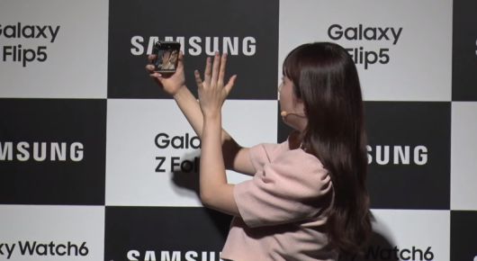 22일 일본 현지에서 개최된 갤럭시Z플립5·폴드5 언팩에서 삼성전자 직원이 갤럭시Z플립5를 소개하고 있다. 삼성 재팬 유튜브 캡처 |