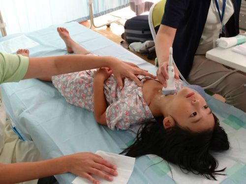 갑상선암 검사를 받는 어린이.일본 후쿠시마현에서는 원자력발전소 폭발사고 후 갑상선암 발병이 증가했다. 사진=교도통신 |