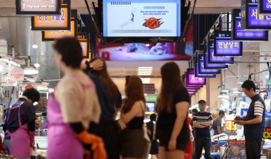 일본 정부가 후쿠시마 제1원전 오염수 방류를 결정한 22일 오전 서울 동작구 노량진수산시장 모니터에 '일본 수산물 수입 금지 지역' 안내 영상이 나오고 있다. 기시다 후미오 일본 총리는 이날 각료회의에서 오는 24일부터 후쿠시마 제1원전 오염수를 방류한다고 공식 결정했다. 뉴스1 |
