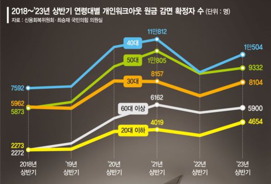 22일 국회 정무위원회 소속 국민의힘 최승재 의원이 신용회복위원회로부터 제출받은 자료에 따르면 올해 상반기 기준 개인워크아웃을 통해 원금감면이 확정된 20대는 4654명으로 집계됐다. 2018년 상반기(2273명) 대비 2배 이상 늘어나면서 상반기 기준 5년래 최대치를 기록했다. 개인워크아웃은 빚이 너무 많아 갚기 어려운 사람이 신용회복위원회의 중재를 통해 빚을 최대 90%까지 줄여주고 이자 부담도 낮춰 빚을 갚을 수 있도록 도와주는 제도다.