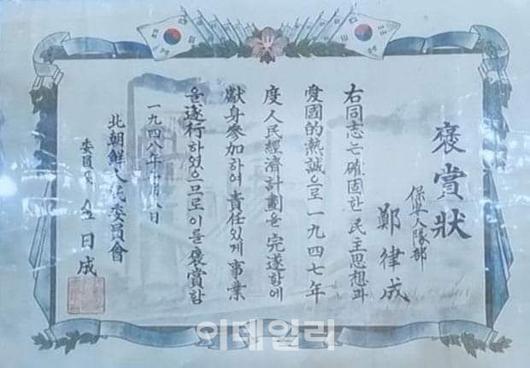 정율성에 대해 1948년 ‘북조선인민위원회 위원장 김일성’ 명의로 내려진 포상장. (사진=박민식 국가보훈부 장관 페이스북) |