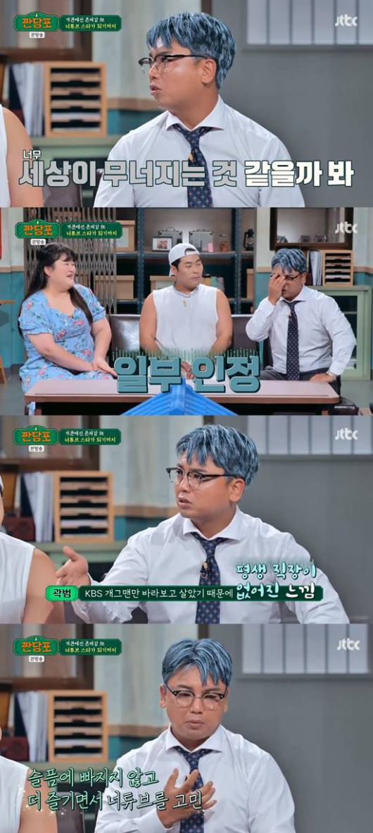 그러면서 그는 "근데 KBS 개그맨만 바라보고 살았기 때문에 평생직장이 없어진 느낌이지 않냐. 거기서 울어버리면 다 포기하는 것 같아서 빨리 이창호 씨랑 다음 스텝을 생각했다"라며 유튜브를 준비했다고 해명했다.
