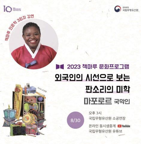 [이데일리 이윤정 기자] 국악인 마포 로르와 함께 ‘외국인의 시선으로 보는 판소리의 미학’을 알아보는 자리가 마련된다. 오는 30일 전라북도 전주시 국립무형유산원 소공연장에서 열리는 ‘책마루 문화프로그램 인문학 강연’에서다.