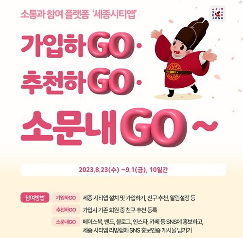 이벤트 참여 방법은 세종시티앱에 새로 가입하거나 알림 설정, 친구를 추천하면 되며, 누리소통망(SNS)에 서비스를 소개하고 이를 세종 시티앱에 인증하면 된다.
