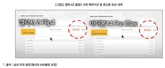 물론 한국 삼성전자 홈페이지에도 트레이드 인 서비스(중고폰 보상 프로그램)가 있다. 하지만 해당 중고폰 보상 프로그램에 이용 시 국내 소비자가 받을 수 있는 혜택은 최대 67만원(카드 혜택 포함)에 불과하다. 반면 미국은 삼성전자 홈페이지에서 Z플립 구매시 900불 할인(사전 예약시 할인 : 119만원-1330원 기준)을 용량 구분 없이 동일한 폭의 할인을 받을 수 있다.