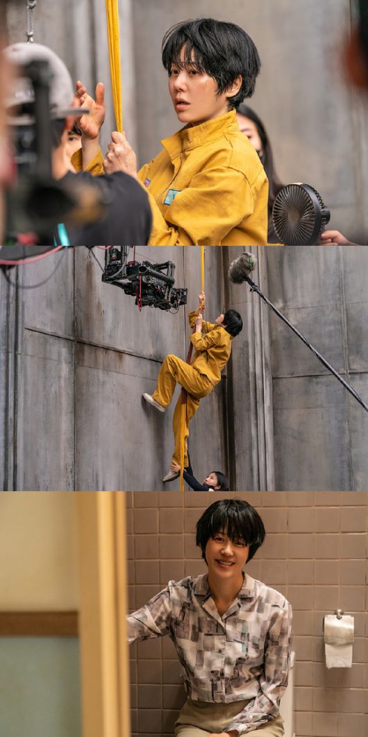 공개된 사진 속 고현정은 숏컷 헤어스타일에 죄수복 차림으로 교도소 벽을 타는 장면을 촬영 중인 모습이다. 스턴트 배우가 아닌 직접 신을 소화하는 모습이 눈길을 끈다.