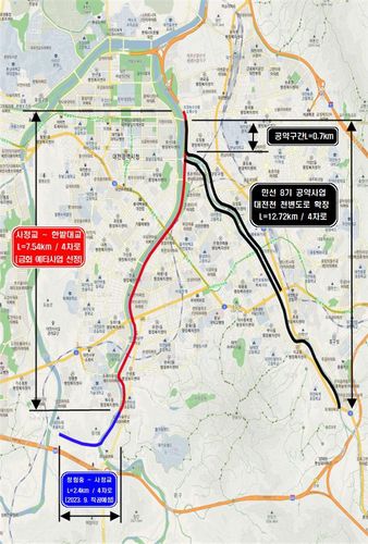 시는 이 구간에 '유등천 합류점∼한밭대교' 구간 0.7㎞도 포함돼 '대전천 천변 도로 확장사업'에 탄력을 받을 수 있을 것으로 전망한다.