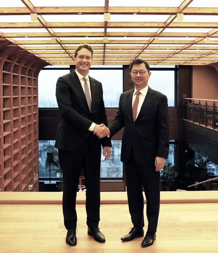 (서울=연합뉴스) 김보경 기자 = 최재원 SK그룹 수석부회장은 23일 서울 종로구 SK서린빌딩에서 방한 중인 메르세데스-벤츠 그룹의 최고경영자(CEO) 올라 칼레니우스 회장을 만나 전기차 분야 협력 강화 방안을 논의했다고 SK그룹이 전했다.
