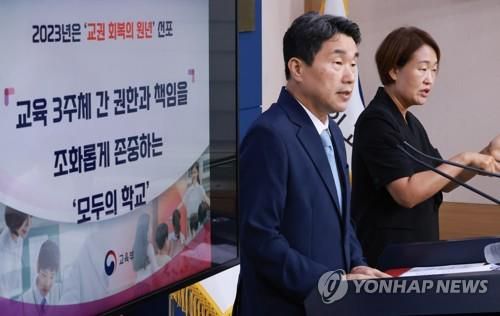 (서울=연합뉴스) 서울 서초구 교사 사망 이후 교권 붕괴에 대한 우려가 커지자 정부가 사건 발생 한 달여 만에 교권을 회복하기 위한 대책을 내놓았다. 교육부가 23일 발표한 '교권 회복 및 보호 강화 종합방안'에 따르면 우선 각종 민원에 교사 개인이 대응하지 않고 학교와 교육청 같은 기관이 대응하는 체제로 바뀐다. 이를 위해 학교장 책임하에 교감과 행정실장, 교육공무직 등 5명 내외로 민원 대응팀을 만들기로 했다. 그동안 학교장이 교육활동 침해로부터 교사를 제대로 보호하지 못했다는 지적이 많았다. 개별 학교 차원에서 다루기 어려운 민원은 교육지원청에서 처리할 수 있도록 통합 민원팀도 운영한다. 또 교사는 개인 휴대전화를 통한 학부모의 민원 요청에 응하지 않을 수 있도록 했다. 일선 교사들이 나 홀로 각종 악성·과잉 민원에 시달려왔다는 현장의 목소리를 반영한 대책들이라고 할 수 있다.