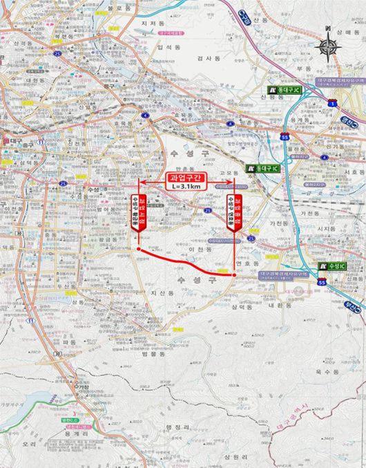 시 관계자는 "예비타당성조사가 최종 통과될 경우 도로 개통 시점에 달구벌대로 전체 교통량의 25%, 범안로 전체 교통량의 24% 정도가 신설 도로로 분산돼 주변 도로의 교통 혼잡이 개선될 것으로 예상된다"라고 밝혔다.