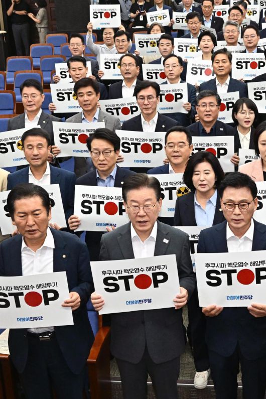 더불어민주당 이재명 대표를 비롯한 의원들이 24일 국회에서 열린 의원총회에서 ‘후쿠시마 오염수 방류 정지’ 피켓팅을 하고 있다. 사진=서동일 기자 |