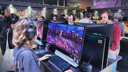 (서울=연합뉴스) 23∼27일(현지시간) 독일 쾰른에서 열리는 '게임스컴 2023'에 참가한 게이머들이 QD-OLED 모니터로 '별이되어라2'를 즐기는 모습. 2023.8.25 [삼성디스플레이 제공. 재판매 및 DB 금지] |