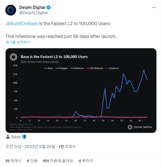 베이스는 가파른 성장세를 보이고 있다. 25일 가상자산 리서치 업체 델파이 디지털은 공식 엑스(구 트위터)에 “베이스는 가장 빠르게 사용자 10만 명을 달성한 L2 블록체인”이라고 전했다. 베이스가 출시된 지 불과 56일 만에 이룬 성과다.