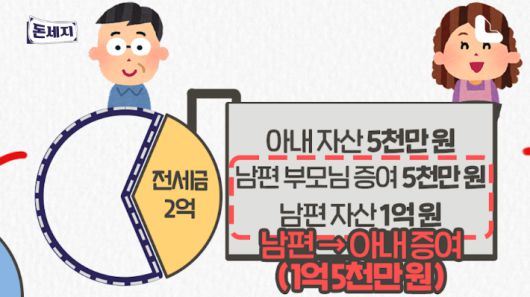 ◆ 엄해림> 근데 여기서 보면 아내의 자산이 5천만 원 이미 들어가 있어요. 이 부분은 '남편분한테 전세하라고 차용해줬다'라고 소명을 할 수 있는 부분이 있는데. 여기 남편 부모님으로부터 증여를 받아 거는 명백한 남편분의 자산이기 때문에 그냥 아내에게 증여가 됐다라고 볼 수밖에 없는 부분이에요. 그리고 남편분 자산 1억도 실제로는 증여로 보여질 가능성이 있어서 2억 중에 1억 5천은 남편분으로부터 증여를 받았다라고 원칙적으로는 보여집니다.