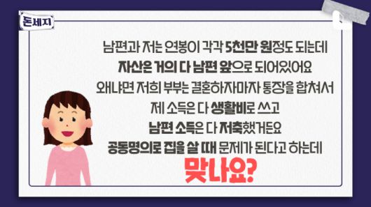 ◇ 김수영> 맞벌이로 집을 매수할 때는 그냥 우리가 당연히 5:5 공동명의로 해야 된다고 생각하는데 이게 좀 문제가 될 수도 있는 건가요?