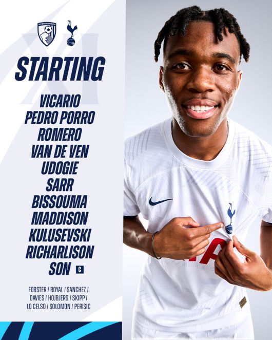 본머스전 선발 명단이 공개됐다. 맨체스터 유나이티드전과 같은 라인업이다. 손흥민은 공격수로 선발 출전한다. 히샤를리송, 데얀 클루셉스키와 호흡을 맞춘다. 중원에는 제임스 매디슨과 이브 비수마, 파페 마타 사르가 포진한다. 데스티니 우도기, 미키 판 더 펜, 로메로, 페드로 포로가 포백을 구성한다. 굴리에모 비카리오가 골키퍼 장갑을 낀다.