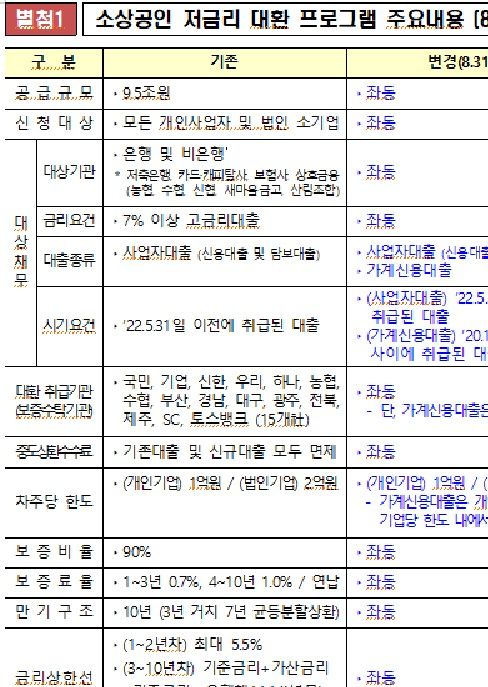 이번에 저금리 대환프로그램에 포함되는 가계대출은 △사업을 정상 영위중인 개인사업자이며 △최초 취급시점이 코로나19 시기인 2020년 1월1일부터 2022년 5월31일까지이고 △대환신청 시점에 금리가 7%이상 △신용대출과 카드론인 경우다.