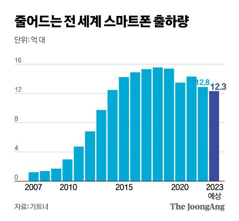 이에 삼성에 비해 중저가 모델 판매 비중이 낮은 애플이 당분간 시장 침체 영향에서 비교적 더 자유로울 것이라는 분석이 나온다. 애플은 그동안 별도의 저가형 모델을 출시하는 대신 구형 아이폰으로 중저가 시장 수요에 대응해왔다. 김동원 KB증권 연구원은 “프리미엄 스마트폰 시장에서 뚜렷한 경쟁 제품이 부재한 상황에서 애플은 올 하반기 아이폰15 시리즈를 공격적으로 출하할 것으로 보인다”고 말했다.