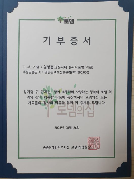 봉사나눔방 '라온'은 남들이 꺼려하는 어려운 곳이나 미처 손길이 닿지 않는 소외된 곳을 찾아 매달 봉사활동을 하고 있으며 25개월 동안 로뎀의집을 포함하여 쪽방촌, 용산박스촌, 서울시아동복지협회, '희망을파는사람들'을 통해 급식봉사와 어려운 청소년자립을 위한 후원금 기부 등을 해오고 있으며 누적 기부액은 현금 6,040만원과 물품 1,816만뭔 상당이다.