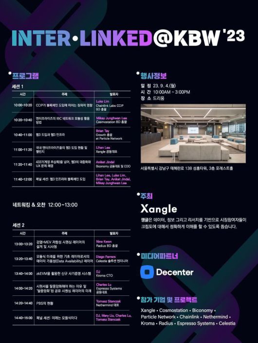 오후에는 니나 권(Nina Kwon) 라디우스(Radius) 사업개발 총괄, 디에고 페레스(Diego Ferrers) 셀레스티아 솔루션 엔지니어, 데릭 장(DJ) 크로마(Kroma) 최고기술책임자, 찰스 루(Charles Lu) 에스프레소 시스템(Espresso Systems) 공동대표 그리고 토마스 스탠자크(Tomasz Stanczak) 네더마인드 창업자 순으로 발표한다. 이어지는 대담 ‘미래는 모듈식이다’ 로 전체 행사가 마무리된다.