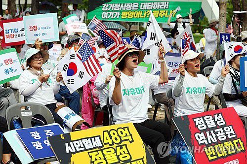 (광주=연합뉴스) 정다움 기자 = 5·18 기념재단은 28일 정율성 기념사업 철회 촉구 집회에서 5·18 민주화운동을 폄훼한 혐의로 보수정당인 자유통일당을 경찰에 고발한다고 밝혔다.