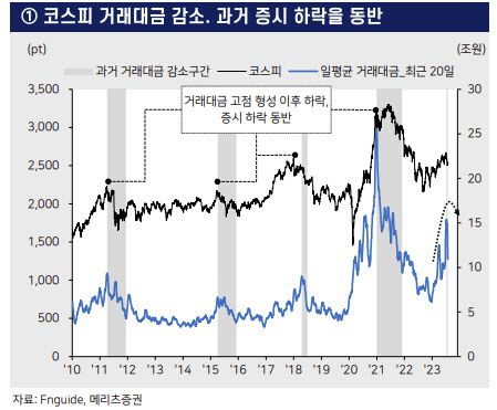 이정연 메리츠증권 연구원은 29일 “과거에도 거래대금 고점을 형성 이후 감소 구간에는 증시 하락이 동반됐다”며 “거래대금 고점 형성일에 음봉으로 마감할 경우, 증시는 강한 매수자에서 약한 매수자로 손바뀜이 나타났을 가능성을 시사하기 때문”이라고 밝혔다.