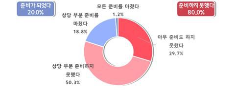 조사에 따르면 50인 미만 중소기업 80%는 '중대재해처벌법 시행에 준비하지 못했다'고 응답했다. 특히 '아무 준비도 못했다'는 기업이 29.7%에 달했고, '상당 부분 준비하지 못했다'는 기업이 50.3%를 차지했다. '모든 준비를 마쳤다'는 곳은 1.2%에 불과했다.
