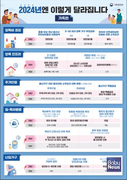 임신과 출산을 희망하는 가구에 대한 지원도 신설됐다. 남녀 필수 가임력 검진비와 냉동 난자를 활용한 보조생식술, 중소기업 근로자 난임치료휴가 급여 2일치를 지원하며, 고위험 임산부, 미숙아 선천성이상아 의료비 지원의 소득요권도 폐지했다. 지원기간도 기존 16개월에서 24개월로 늘어난다.