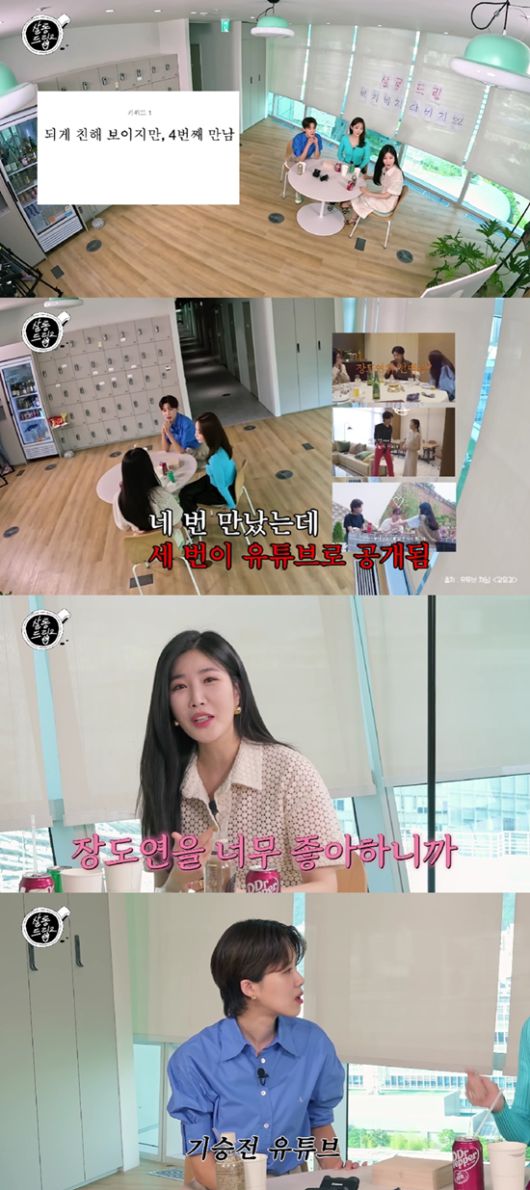이해리, 장도연은 이진호가 연결해 준 사이다. 첫 만남을 묻자 이해리는 "너무 좋았다. 장도연을 싫어하는 사람이 있냐"라며 "사실 그때는 오히려 많은 얘기를 못 했다. 얘(강민경)도 많이 취하고 나도 많이 취했을 것"이라고 이야기했다.