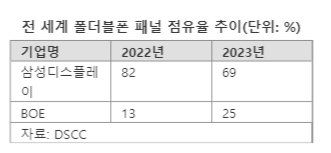 삼성디스플레이의 올해 폴더블 패널 점유율은 69%로, 전년(82%) 대비 13%포인트 하락이 예측됐다. 반면 중국 최대 디스플레이 업체 BOE의 점유율은 13%에서 25%로 확대될 것으로 DSCC는 내다봤다. BOE가 중국 스마트폰 제조사들에 폴더블 패널을 대거 공급하며 1년 새 공급량이 157% 늘어날 것으로 전망됐다. BOE는 '다이아몬드 픽셀' 등 삼성디스플레이의 스마트폰용 유기발광다이오드(OLED) 핵심 특허 침해 의혹 등으로 현재 삼성디스플레이와 소송전을 벌이고 있다.