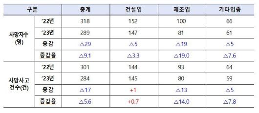 주요 업종별 사망자를 살펴보면 건설업은 147명, 제조업은 81명으로 지난해보다 각각 5명, 19명 줄었다. 규모별로는 근로자 50인 미만(공사금액 50억원 미만) 사업장은 179명으로 1년 전보다 18명, 50인 이상(공사금액 50억원 이상) 사업장은 110명으로 11명 감소했다.