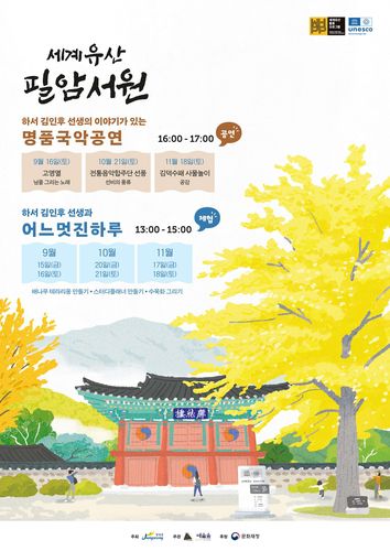 군에 따르면, 올해 국악공연은 '세계유산 필암서원, 호남의 선비 하서 김인후 선생을 만나다'를 주제로 관객과 만난다. 9월에서 11월까지 매월 셋째 주 토요일 서원 앞 잔디마당에서 열릴 예정이다.