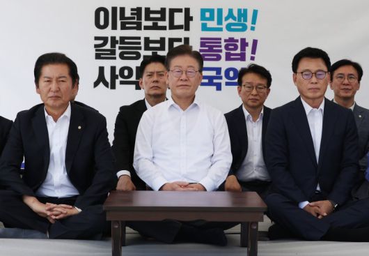 더불어민주당 이재명 대표(가운데)가 8월 31일 오후 국회 본청 앞에서 단식 농성을 하고 있다. 이 대표는 이날 취임 1주년 기자간담회에서 "무능 폭력정권을 향해 국민항쟁을 시작하겠다"며 무기한 단식 농성에 돌입했다. 연합뉴스 |