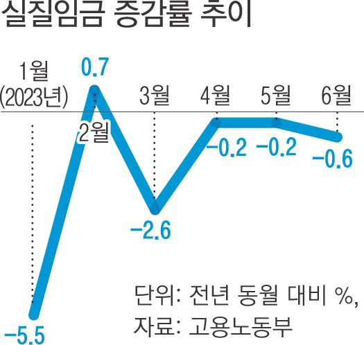 하지만 1~6월 물가수준을 반영한 노동자 1인당 월평균 실질임금은 355만8000원으로 전년 동기(361만3000원) 대비 1.5%(5만5000원) 감소했다. 명목임금이 올라도 물가 인상 때문에 실질임금은 되레 줄어든 것이다.