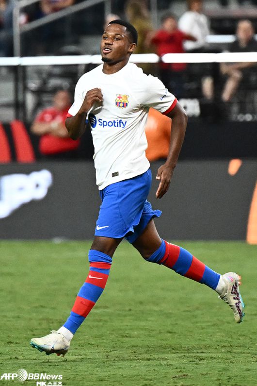 안수 파티가 AC밀란(이탈리아)과 2023-24 바르셀로나 프리시즌 친선경기 득점 후 기뻐하고 있다. 사진=AFPBBNews=News1 |