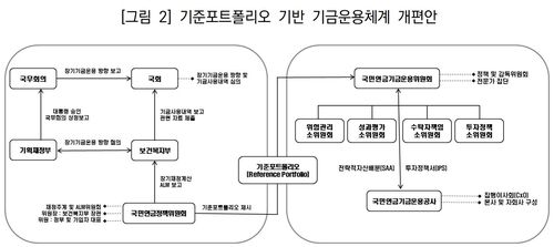 국민연금정책위원회가 위험자산 배분, 장기 재정추계 등 기금 운용의 큰 방향을 '기준 포트폴리오'로 제시하면 국민연금기금운용위원회가 전략적 투자 의사결정을 하고, 공공기관인 기금운용공사가 투자를 실행하도록 하자는 구상이다.