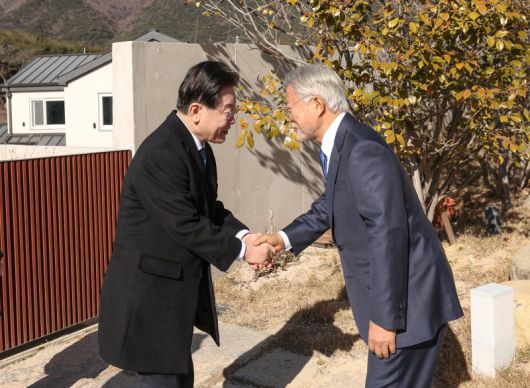 문재인 전 대통령(오른쪽)과 이재명 더불어민주당 대표가 지난 1월 2일 오후 경남 양산시 하북면 평산마을 사저에서 악수를 나누고 있다. (더불어민주당 제공) |